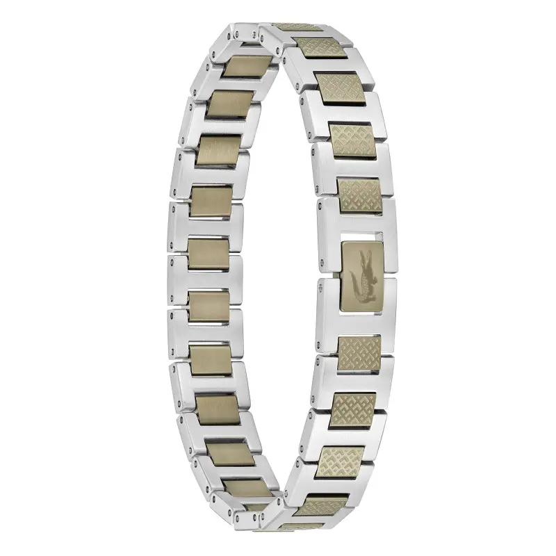 De sa collection Metropole, la marque présente ce magnifique bracelet au design H-link qui ne vous laissera pas indifférent ! C’est un bijou tendance, raffiné et intemporel qui se porte au quotidien avec n’importe quelle tenue, d’une allure chic à une apparence sportive. Fabriqué en acier inoxydable, il mesure 19 cm de longueur et peut s’adapter à tous les poignets en y enlevant des maillons. Il est formé par des maillons “H” de couleur argentée et au fini brillant. Ceux-ci sont connectés par des maillons rectangulaires pourvus d’un placage ionique de couleur bronze, faisant toute la distinction de ce bijou. La surface de ces derniers est rehaussée par un aspect texturé reprenant le motif petit piqué des fameux polos de la marque. Agréable à porter, ce bracelet est un must have de tout homme stylé. Vous pourrez le manier aisément et en toute sécurité à l’aide de son fermoir clipable gravé par le crocodile Lacoste.