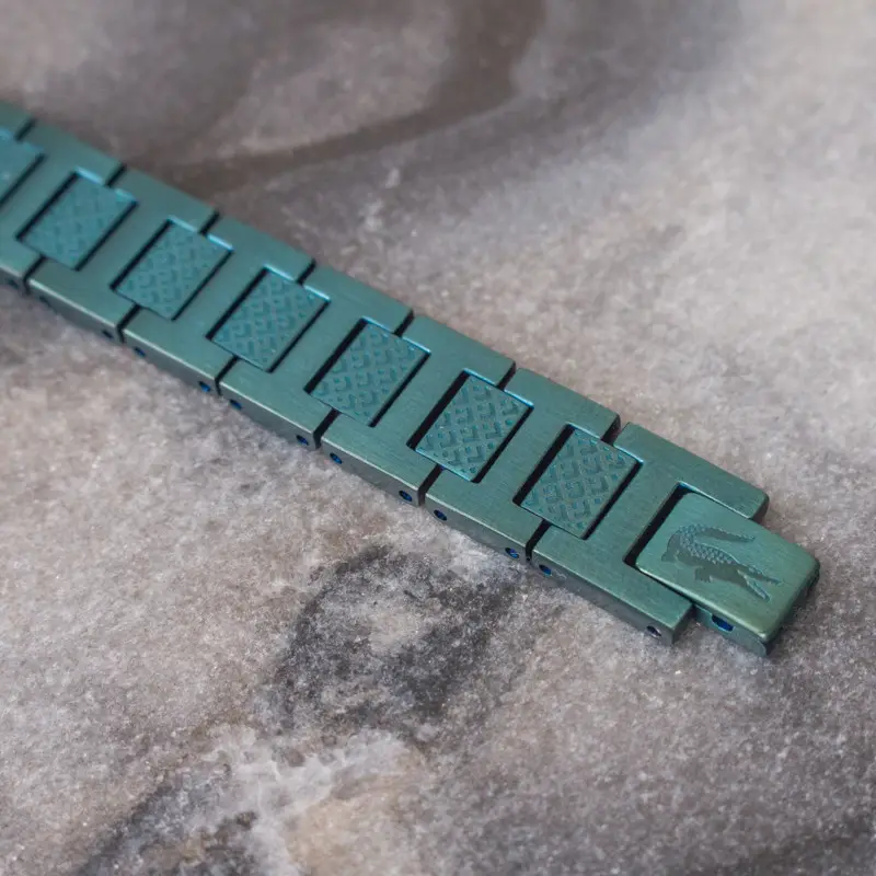 Conjuguant élégance sportive et chic urbain, ce charmant bracelet est le choix parfait pour compléter votre look quotidien. Issu de la collection Metropole, il se distingue par son design H-link aux lignes intemporelles et sa belle couleur verte due à son placage ionique. Il est conçu en acier inoxydable et présente une rangée épurée de maillons. Ceux en forme “H” sont connectés par des maillons texturés qui apportent à l’ensemble un aspect plus distingué. Ces dernières s’inspirent des polos Lacoste et reprennent leur motif petit piqué pour un rendu accrocheur au poignet. Mesurant 19 cm de longueur, ce bracelet s’adapte à tous les poignets en enlevant des maillons. Vous pourrez l’enfiler avec vos tenues de jour comme de nuit, il sera l’addition moderne qui les rehaussera. Gravé par le crocodile de la marque, son fermoir clipable assure un bon maintien tout au long de la journée.