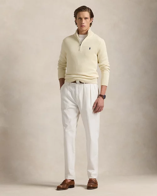 • Col cheminée en tricot côtelé. Patte demi-zippée.