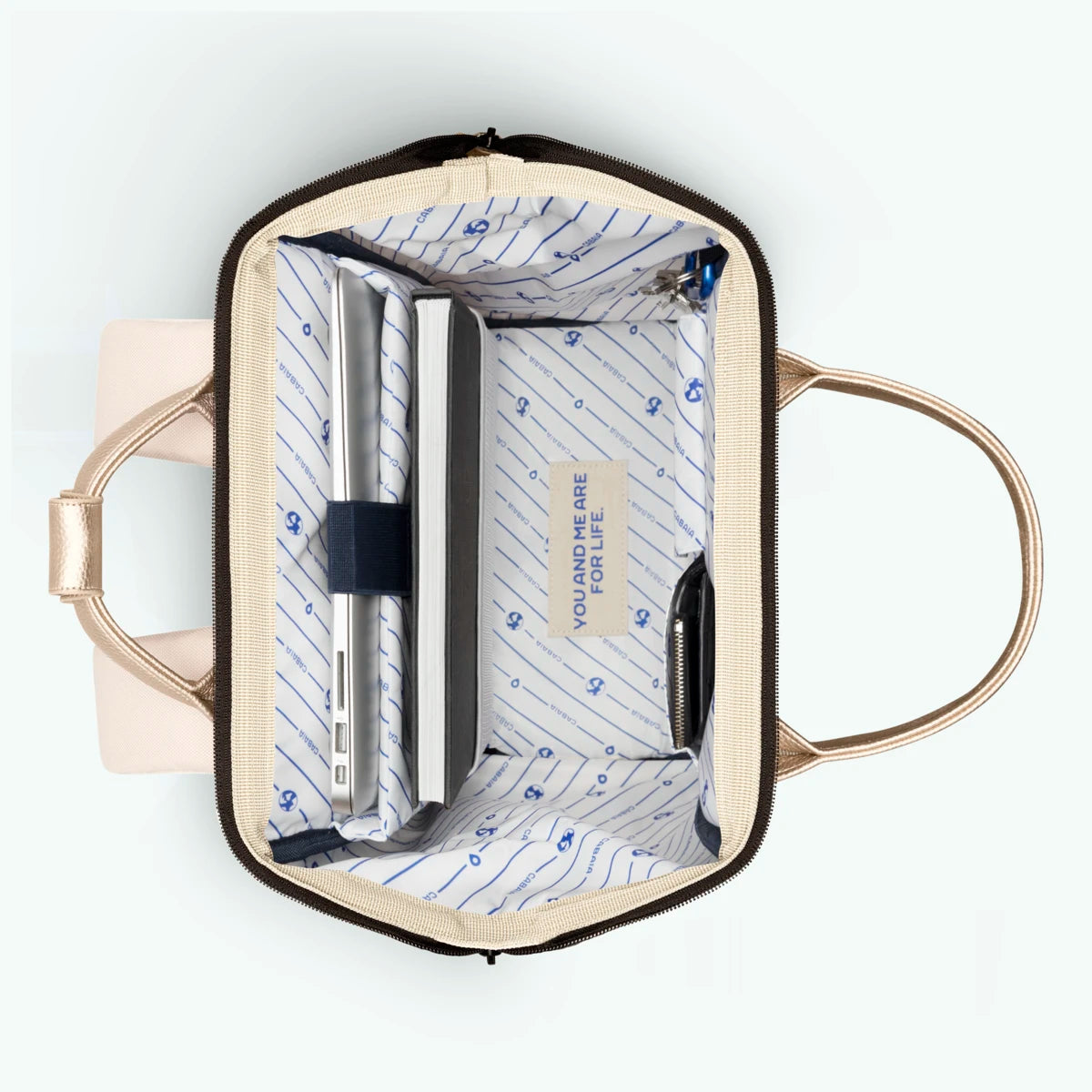Ce sac est accompagné de 2 poches interchangeables : beige unie (Jardin d’Essai) + beige unie brillante (La Casbah)
